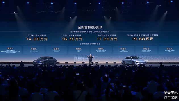 3月3日,吉利 银河E8推出的2025款车型在三亚正式亮相。这款新车与之前的版本主要的不同之处在于,它搭载了先进的激光雷达技术,并且在技术配置和整体性能上都得到了显著的提升。因此,这款车的市场竞争力得到了进一步的加强,并计划搭载全新的千里浩瀚智驾。这款新车总共推出了四种不同的车型,其指导售价范围在15.38至20.28万元之间,而限时优惠价格则在14.98至19.88万元之间。