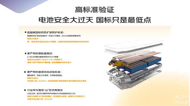 电池安全一直是纯电车型的关键痛点,铂智 3X 在这方面采用了远超国标的严格标准。在电芯安全层面,导入翼翅顶盖设计、蓝光复合激光焊、电芯内外双绝缘等先进技术,电解液、电芯隔膜和正极材料均使用特制的耐高温材料,有效避免电芯起火。同时,满足远超国标的热扩散防护标准,实现单一电芯热失控后不起火不爆炸、不因热量传递导致相邻电芯热失控。在验证标准层面,通过了更严苛的热扩散和侧柱碰测试,底部球击实验中电芯侵入量<0.5mm,还新增 “山” 形仿真测试,电池包也历经振动、挤压、浸水等 9 大极限测试,确保在极端场景下仍能稳定运行。
