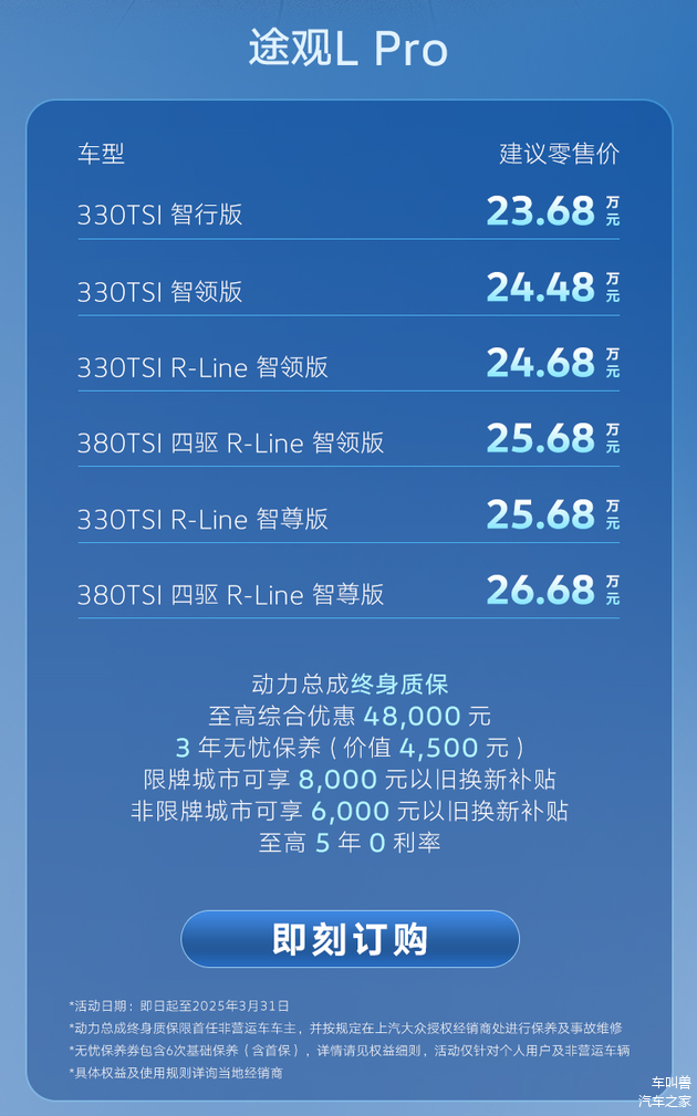 在3月份,上汽大众途观L Pro给出了至高综合优惠48000元的新车销售福利且提供动力总成终身质保、价值4500元的3年无忧保养,至高5年0利率以及限牌城市8000元和非限牌城市6000元的以旧换新补贴。