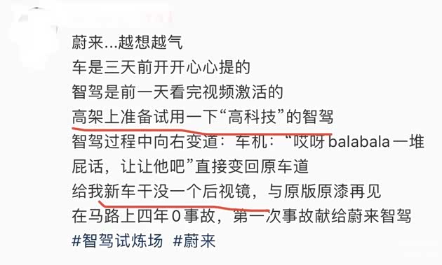 不久前,一位蔚来车主反映:第一次使用车辆智驾就被伤害了,违规变道,干费了一个后视镜。