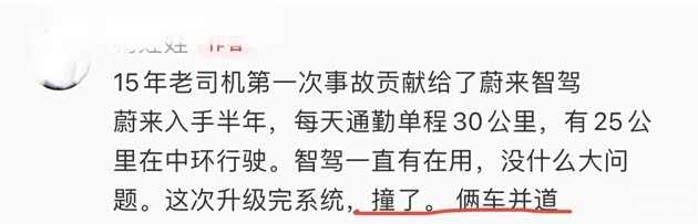 一位蔚来车主反映:买车半年,智驾功能用得很频繁,之前一直顺风顺水,没出过啥岔子。可谁能想到,最近系统升级之后,直接撞了。