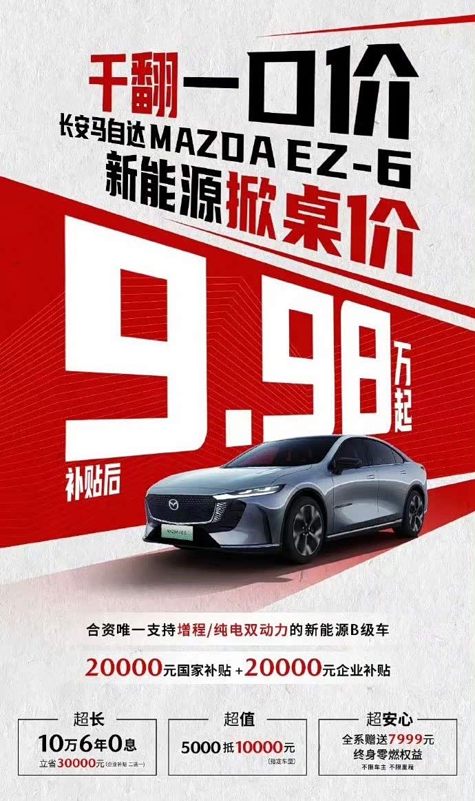 长安马自达也卷起来了?EZ-6补贴后9.98万元起!又是一台A级车价格买B级车。