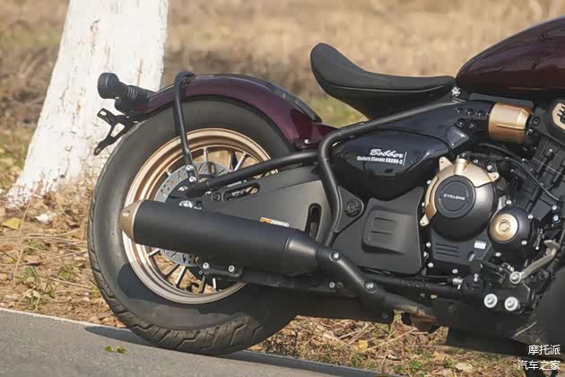 悬挂部分RA600采用了一套传统的油压正置前减震和一个位于座垫下方的预载可调中置后减震,为了尽量营造出硬尾的原始观感,钢管焊接后摇臂的线条在外形上延续了主车架的角度。这类巡航车因为较大的胎侧高度,无需更长的减震行程就能获得不错的舒适度,体验上RA600也并无意外。
