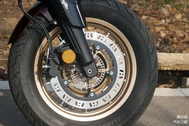 前130/90R16后150/80R16的(量产版为正新半热熔)轮胎本身的簧下质量不轻,搭配铝合金压铸轮毂算是往回找补了一点,所以RA600骑起来并不会觉得过于笨拙。制动系统方面RA600搭载一套来自西互的浮动式双活塞卡钳和经典的直推上泵,只能说是够用但并不出彩,当然双通道ABS和可关闭TC并不会缺席。