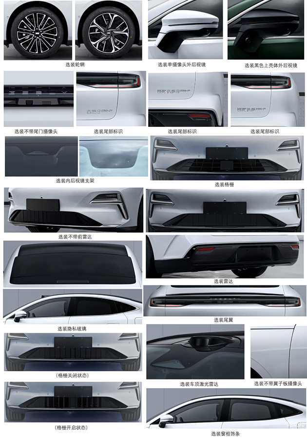 选装的话,新车这次主要申报了电子外后视镜,前组合灯,车尾标识,以及不同样式的轮辋。