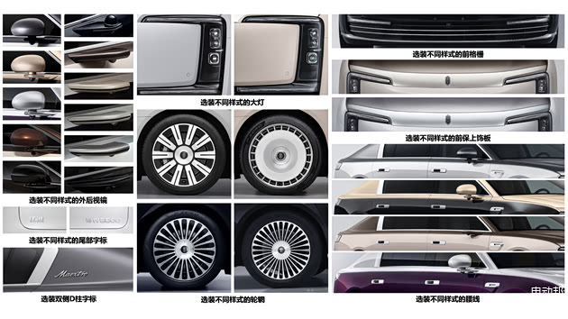 选装配件上,尊界S800将有非常多的双色车身、大灯、腰线、前格栅、外后视镜、轮辋、尾部及D柱字标可选。其中外后视镜还有全新的“球形”样式。