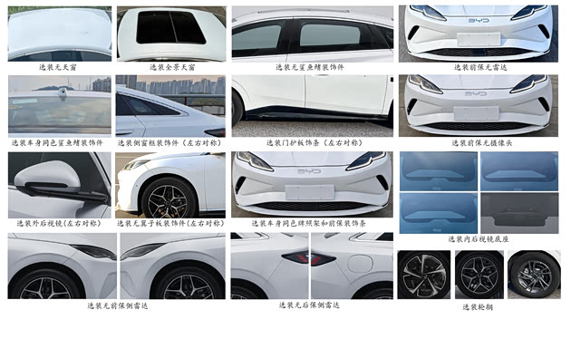 选装部分,我们看到这款车有全景天窗,侧窗框装饰件,门护板饰条,多种样式轮辋,前/侧/后摄像头、雷达等配件。