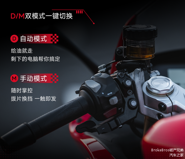 QJMOTOR的2.0版AMT技术号称赛用级序列变速箱,简单来说就是用电脑替代了人脑的切离合换挡操作,由AMT换挡辅助机构在程序预设的(车速、转速等)工况下自动完成升挡和降挡操作。换挡操作在0.1秒内瞬间完成,实现了比人工更快更稳的丝滑换挡。因此左手边传统的离合拉杆和左脚位置的换挡杆就不复存在了。右脚边的后刹踏板被移到了左手的位置,双脚被彻底释放出来。对于希望将换挡时机掌控在自己手里的朋友,赛450AMT提供了自动模式/手动模式的切换功能,在手动模式下,用户可以通过左手组合开关上的换挡拨片来实现手动换挡操作,达成对挡位的实时掌控。
