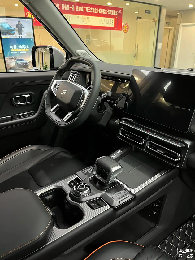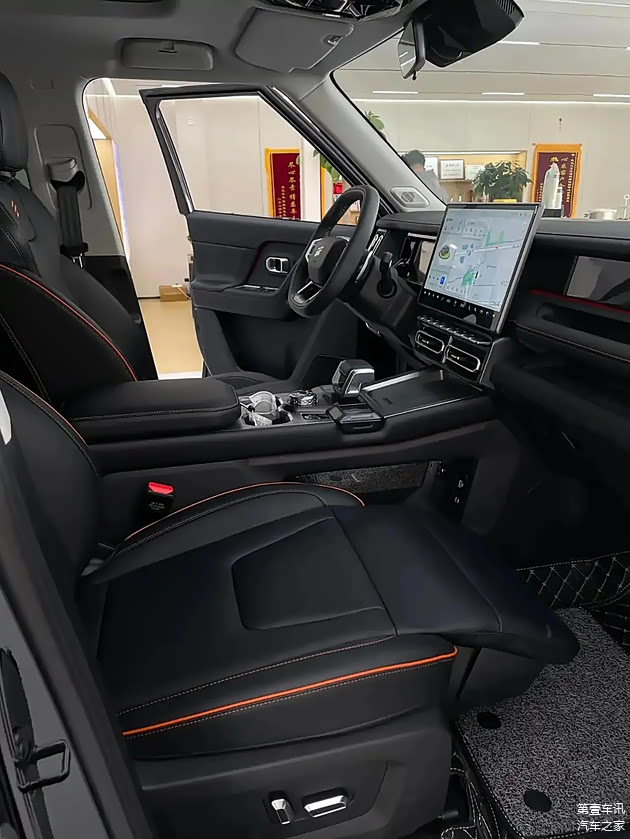 当你走进车里,你会注意到几乎到处都是直线的设计,同时,你的副手、多边形的四辐方向盘和硬核的飞机挡把都展现出了硬核设计的风格。中控台配备了一块10.25英寸的巨大显示屏,这与全液晶仪表板和氛围灯装饰板相得益彰,共同营造出一种浓郁的科技氛围。搭载了8155芯片的车辆系统为驾驶者带来了一种更加高级的智能驾驶体验。这款车的内部装饰设计极为丰富和多变,采用了如雪山白、秘林绿等多种颜色,并搭配了皮革作为覆盖材料。此外,这款车由50W的无线快速充电系统、水晶挡把和64色的氛围灯组合而成,为驾驶者和乘客提供了一个奢华而舒适的驾驶和乘坐环境,展示了其豪华的品质。