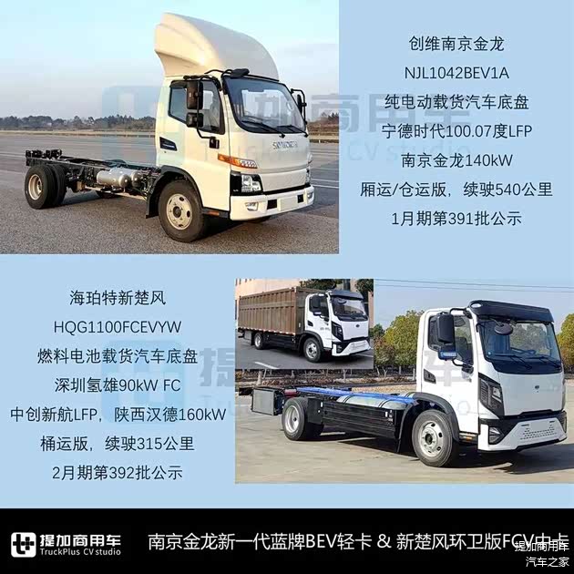 - 创维旗下南京金龙1月期申报了NJL1042BEV1A纯电动载货汽车底盘,以及厢运/仓运版整车,利用江淮骏铃V系同款产品资源,准乘3/2人,轴距3365mm,可选两组板簧悬挂,搭载宁德时代100.07度LFP动力电池、轴间车架内部布置,南京金龙140kW驱动系统,以厢运版为例,形成整车后厢长4.15米,额载1150/1215kg,续驶540公里。南京金龙首款蓝牌轻卡谱系为东风华神T1系列同款,另有与凯马锐航同款的加强型小卡,本次新品也及时进行了产品线更新。