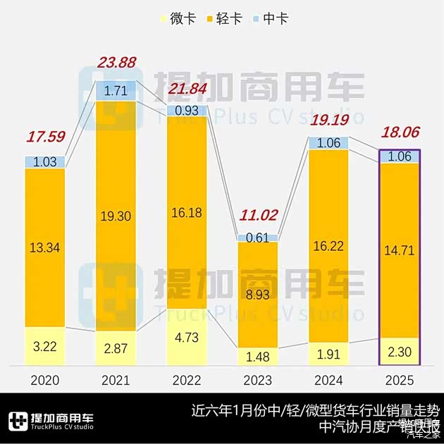 根据中汽协数据统计,今年1月份中/轻/微型货车总体销售180645辆、同比下降5.88%,在近六年同期里处于中游水平,逊色于2021、2022和2024年表现,仅好过2020和2023年。具体看:中型和微型货车都保持了正向增长势头,分别为0.27%和20.36%;而轻型货车则同比下滑9.34%,从整车到底盘销售都呈现疲软态势,考虑到国内需求偏弱、加之基数较大,虽然出口业务稍有看涨,但净减少超1.5万辆也未能弥补大盘的整体走低——此处与重型货车走向一致,2025年的中/轻/微型货车市场也在低谷中开局。