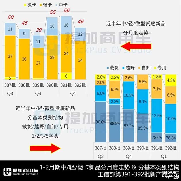今年一季度前两月期的工信部第391-392批公示,N类中/轻/微型货底新品分别为56和46款,同比分别增长7.7%和下降25.8%,重新恢复“春节假期必走低”的季节性特征。其中:轻卡货底连续保持34-34款,作为新品的中流砥柱而整体企稳;中卡货底为16-12款,结合前几月成绩可知,2月期虽有下滑、但仍高于平时表现;微卡货底作为偶然因素较大的品类,1月期因河北长安拉动而骤增,长期来看主要受产品系列化和“1人车/MINI卡”的影响。具体看:
