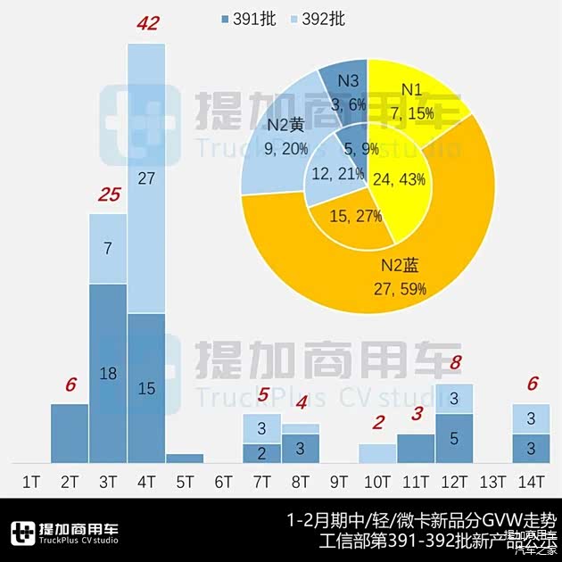 - GVW=4.5-12吨的N2类黄牌新品合计21款、占比20.6%,7-8吨大轻卡九款和10-12吨中卡13款构成两个集中范围,但前者亦有向后者渗透的少数加强版车型。GVW=12-14吨的N3类新品合计八款、占比7.8%,包括两款12.5吨大中卡新品。