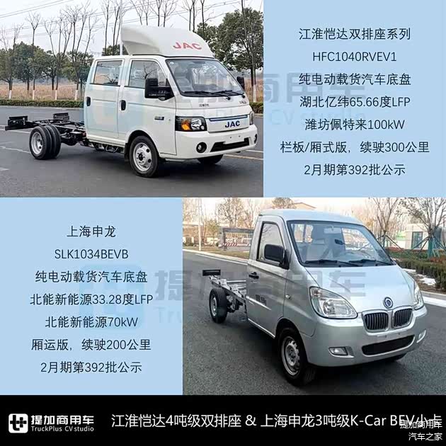 - 江淮2月期申报了恺达系列双排座新品HFC1040RVEV1纯电动载货汽车底盘,以及栏板/厢式版整车,这也是目前行业首款4吨级加强型双排座小卡。该车GVW=4140kg,基础车宽1750mm、准乘2+3人,前/后轮距1470/1485mm保持小卡规格,轴距3.1米,前3片、后3+2片板簧悬挂,后双胎驱动、175号轮胎,搭载湖北亿纬65.66度LFP动力电池、轴间车架内底置方案,潍坊佩特来100kW驱动系统,以厢运版为例,形成整车后厢长3米、额载1465kg,续驶300公里。