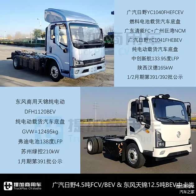 - 广汽日野1-2月期分别申报了新款YC1040FHEFCEV燃料电池载货汽车底盘和YC1041FHEBEV纯电动载货汽车底盘,以及冷藏版和厢运版整车。从驾驶室可知,广汽日野本次新品与潍柴蓝擎悦EH系共享产品资源,宽2.1米、准乘2/3人,轴距3360mm,可选三组板簧悬挂,三电系统方面:二者均搭载陕西汉德165kW电驱桥(福建艺达驱动电机);FCV版搭载广东清能燃料电池+广州巨湾NCM动力电池,氢气瓶和电池组均为车架轴间底置方案;BEV版搭载中创新航133.95度LFP动力电池、车架轴间内部底置方案,续驶647公里。