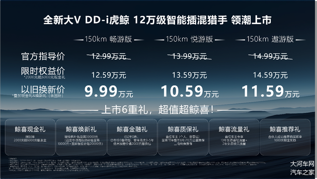 全新大V DD-i虎鲸以150km纯电续航与1172km综合续航,直击用户里程焦虑,实现同级最长纯电续航。北京等超大城市用户“一周一充”,即可覆盖日常通勤;同级领先的0.7L 百公里综合油耗,进一步降低用户的用车成本,相较于同级燃油车,全新大V DD-i虎鲸一年可以省出一部高端手机。