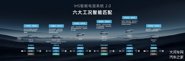 全新大V DD-i虎鲸升级IHS智能电混系统2.0,遵循“纯电优先,高效用油”的工作原理,智能匹配六大工况,无需手动设置或切换,即可在节省能耗和保证动力之间找到最佳平衡。