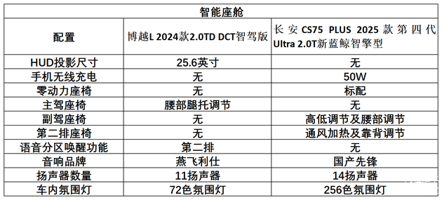 博越L 车内用料环保健康材质较多,对家人照顾比较到位,丰富娱乐APP可满足年轻人不同娱乐需求,语音识别前后排可见即可说,律动光幕配合品牌音响,家人朋友坐进车内,欢快不停,科技感营造更好,第四代长安CS75PLUS内饰三联屏比较大气,内饰设计比较简约,整体给人稳重豪华感,娱乐科技配置较少,语音识别仅支持主副驾,且音响为普通品牌,这一点有些欠缺,两款车座椅都配备女王副驾,但主驾博越L多了四项电动腰托,对主驾照顾比较到位。