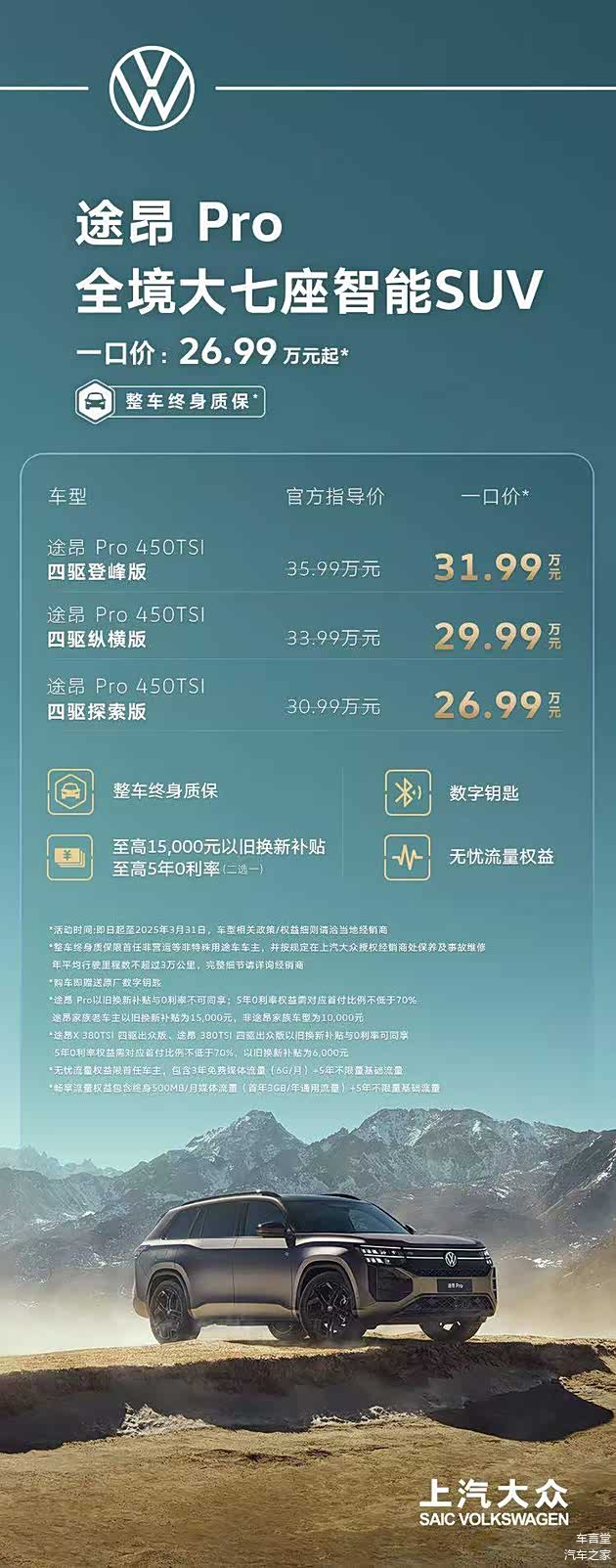 从定价看,全新途昂Pro一共有三款车型,官方指导价30.99-35.99万元,当然在指导价背后是官方一口价:26.99-31.99万元,再配合免息金融、置换补贴等,实际终端到手性价比颇高,要知道当年25、6万也只能买到途观。