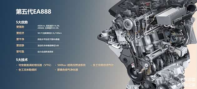 这次新车上市,最大的亮点莫过于全新的第五代EA888发动机,相比老款机型,新发动机拥有VTG可变截面涡轮增压器,提升了低速扭矩;500bar超高压燃油系统,实现更精准的燃油喷射控制和更好的雾化效果;全工况米勒循环,低油耗区域覆盖范围相比前一代产品扩大超过5倍;紧耦合排气净化装置,曾经的颗粒捕捉器再生难题已彻底解决。与之匹配的是代号DQ501的7挡湿式双离合器变速箱,官方显示零百加速仅需7.6秒,而百公里油耗为8.35L。