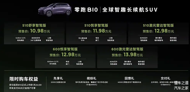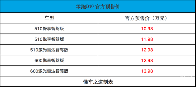 【懂车之道 产品】近日,懂车之道获悉, 零跑B10开启预售,共推5款配置车型,预售价区间为10.98-13.98万元。零跑B10是B平台推出的首款车型,基于LEAP 3.5技术架构打造。