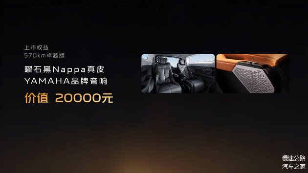 若你平日以短途出行为主,570km卓越版无疑是高质价比之选。1100L超大后备厢装载露营装备毫无压力;全车静音电吸门,关门时不会打扰家人休息;六个独立座椅标配加热/通风/记忆,带来全员舒享体验。此外,该版型还限时加赠曜石黑Nappa真皮座椅、YAMAHA殿堂级音响等总价值20,000元的权益。