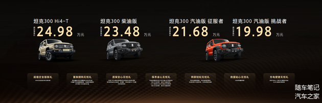 3月10日,2025款 坦克300于珠海横琴文化艺术中心全新上市。2025款坦克300 Hi4-T建议零售价24.98万元,2025款坦克300柴油版零建议售价23.48万元,2025款坦克300挑战者建议零售价19.98万元,征服者建议零售价21.68万元。