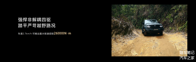 得益于长城汽车24年柴油乘用车研发经验,坦克300柴油版拥有“更劲、更静、更省”三大优势。坦克300柴油版搭载的2.4T全新一代高性能低油耗柴油发动机,专为长途穿越和拖挂需求用户打造,最大净功率135kW,最大净扭矩480N·m,1500rpm即可爆发峰值扭矩。长城汽车技术中心副总经理王超表示,越野要慢,也要慢中有力,坦克300柴油版在2.7km/h时轮端扭矩最高可放大至26000N·m,配合非解耦四驱结构,再复杂的越野场景也能从容应对。