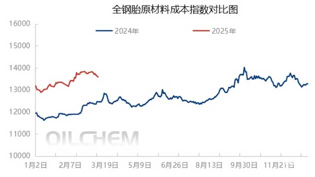 整体而言,据3月10日隆众资讯全钢胎原材料成本调查显示,目前成本指数同比去年同期大涨9.07%。