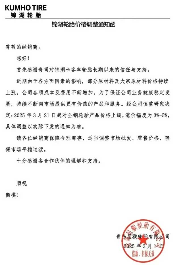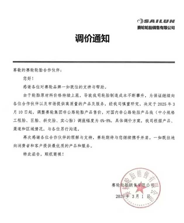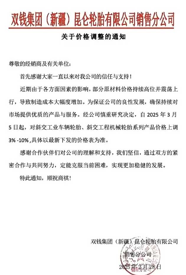 3月10日,双钱集团(新疆)昆仑轮胎有限公司销售分公司发布关于全钢胎系列产品价格调整的通知。