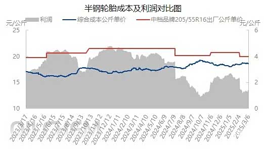 除了全钢胎成本的上升,半钢胎利润也在压缩。据隆众资讯半钢轮胎理论利润分析,截至2025年3月6日,中档品牌205/55R16半钢轮胎理论利润值为1.41元/公斤,同比去年下滑2.41元/公斤。