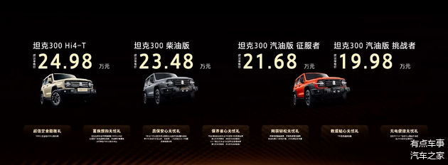 坦克300无疑是一款成功的车型,上市至今累计销量已经超过40万辆,对于一款自主品牌的越野车来说,是一个亮眼的成绩。不过随着更多的对手加入竞争,尤其是新能源车型的崛起,更低的能耗,更适合越野的电驱系统,都让坦克300感受到压力。坦克品牌也通过调整自身的产品线,来应对对手们的进攻,这次的重点除了新的内饰,大家的目光自然集中在Hi4-T与柴油版上。插混车型其实并不陌生,在去年曾以限量的形式,作为2024款车型发售,发售后的市场表现还是不错的,配额迅速被消化掉。这次上市的插混版本则不再限量,对于那些城市为主的用户而言,是一个比较好的选择。最后补充说一说柴油版,柴油版的坦克300同样是呼声很高的车型,对于硬核用户来说,柴油机低转扭矩的特性,以及更强的稳定性,更适合进行深度越野。可见这次坦克300的产品优化都在点子上,相信对于销量会起到一定的增益。