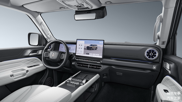 内饰则是完全不同的风格,相比起外观的细微调整,内饰部分更新为大家喜闻乐见的悬浮式中控大屏幕,视觉效果上更干净整洁,并且扩展了更多的可用空间。车机部分引入了Coffee OS 3系统,芯片则使用高通骁龙8155,在硬件方面是目前主流的水平。另外实体按键也得到保留,上半部分是较为常用的空调操作区域,下方则是驾驶相关的功能区域,对于这部分还是比较好评的,作为越野车实体按键还是更安心一些。