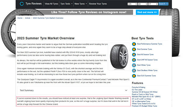 据悉,2022年《Auto Bild》夏季轮胎测试,是玲珑SPORT MASTER的首次亮相。2023年,玲珑SPORT MASTER轮胎再次参与Auto Bild夏季轮胎测试,以排名第7的优异成绩吸引了全球轮胎行业的关注。国外轮胎媒体Tyre Reviews表示:“多年来,玲珑一直在默默地改进产品,如果它在全面测试中表现出色,这将是中国品牌向前迈出的一大步。”