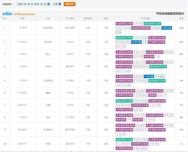 根据车质网提供的数据显示,仅2024年RAV4荣放就有高达1540起质量投诉,高居日系品牌第一位;卡罗拉相对较好,2024年累计投诉量为813起,且在日系车质量投诉排行榜前五中,一汽丰田就占据了四个席位,日系车“省油耐用”的标签已经很难放在一汽丰田上。