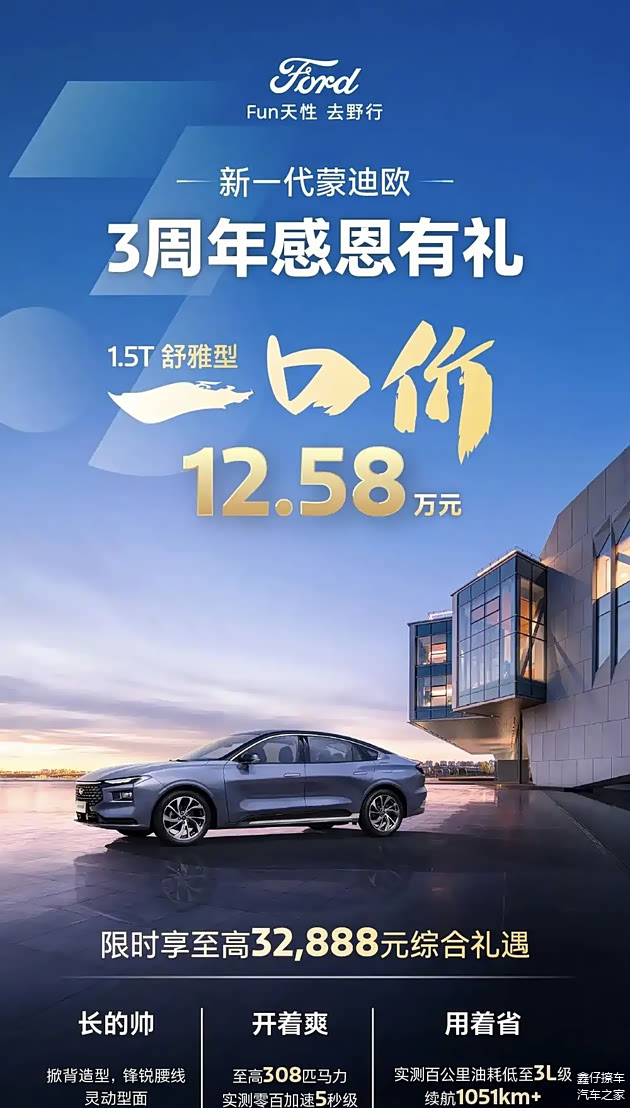 3月12日,长安福特宣布对旗下中型轿车——蒙迪欧推出限时购车政策,其中1.5T EcoBoost舒雅型车型调整至12.58万元,并开放在线预订。同时,2.0T燃油版及2.0T混动版车型也同步推出购车福利,涵盖现金抽奖、置换补贴、购车金融支持及免费保养等多项优惠。此次促销举措不仅提升了蒙迪欧在同级市场的竞争力,也展现了福特品牌在燃油及混合动力轿车市场的战略调整。