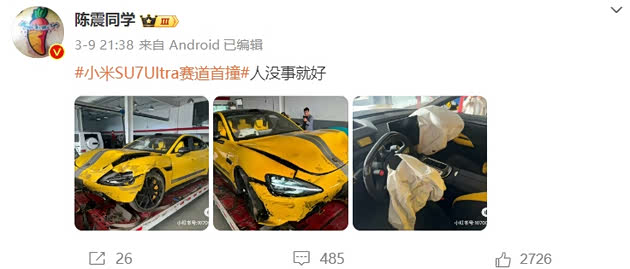 从网传的图片来看,车头受损较为严重,车内两个安全气囊全部爆开。但万幸的是,车内成员并无大碍,事后@陈震同学也在社交账号提及此事并配文:“人没事就好。”