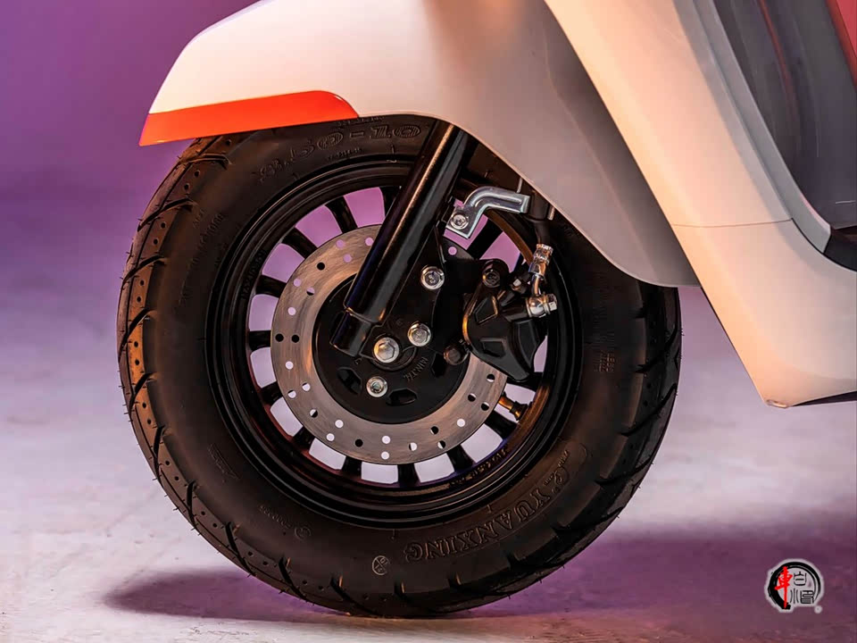 底盘硬件方面,车身框架轻量化设计,低重心骑行稳定。整备质量95kg,座高740mm,适配不同身高骑手。加厚加宽坐垫,舒适性好。开放式手套箱、大面积防滑脚踏满足储物需求。减震系统正置前叉设计,后减震为单边液压弹簧减震,调校适中。刹车系统前盘后鼓,调校合理,提供稳定制动效果。