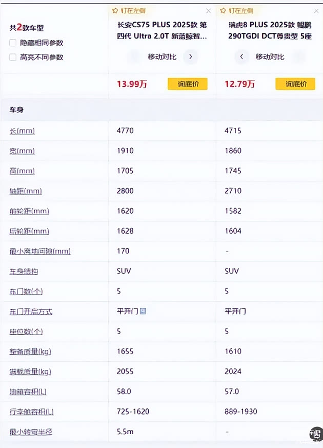 瑞虎8 PLUS和CS75 PLUS在车身尺寸上有所不同,前者为中型SUV,后者为紧凑型SUV。有趣的是,尽管瑞虎8 PLUS的车身尺寸和轴距均小于CS75 PLUS,但其后备箱容积却远超后者。此外,根据网友的反馈,瑞虎8 PLUS的后排腿部空间和头部空间更加宽敞,乘坐舒适度也更好。