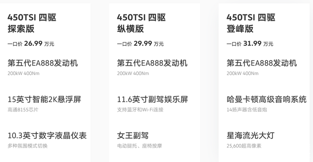 上汽大众途昂Pro作为一款备受瞩目的中大型SUV,提供了三款配置车型以满足不同消费者的需求,分别是四驱探索版、四驱纵横版和四驱登峰版,指导价为26.99万元起。下面,我们就来详细了解一下这三款车型之间的区别。