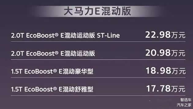 动力系统方面,2025款蒙迪欧1.5T汽油发动机最大功率140千瓦,峰值扭矩258牛・米;2.0T汽油发动机最大功率187千瓦,峰值扭矩393牛・米,汽油版匹配8挡自动变速箱。1.5T E-混动版在1.5T发动机的基础上增加永磁同步电机,电机最大功率96千瓦,峰值扭矩235牛・米;2.0T E-混动版增加的电动机最大功率140千瓦,峰值扭矩为320牛·米,配备E-CVT变速箱和三元锂电池组。