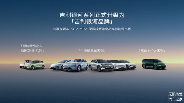 吉利银河品牌的产品矩阵将进一步完善,包含了精品GEOME系列、主流精品车系列、高端MPV系列,涵盖了轿车、SUV、MPV、硬派越野等多种新能源车型,将以全面领先的智能科技,迈向“百万银河时代”,致力于成为“新能源精品车的引领者”。