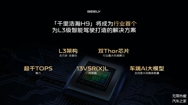 千里浩瀚规划了H1、H3、H5、H7、H9共5大层级智驾方案,即使是H1起步配置方案,算力也超过了 100TOPS,远超行业同级的最高标准。而最顶级的H9方案,更是具备全冗余、全备份的L3架构,支持行业最大车端算力的双ThorU芯片,是首个具有量产落地能力的L3级智能驾驶解决方案。
