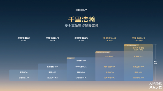 吉利银河未来的全新产品都将搭载千里浩瀚智驾系统,真正实现安全高阶智驾的普及。目前,千里浩瀚H1层级智驾方案已率先在吉利银河星耀8和全新 银河E8上全系搭载。今年下半年,吉利银河品牌全新及改款产品,都将全系搭载不同层级的智驾方案。下半年,吉利银河品牌还将发布一款搭载千里浩瀚H7层级智驾方案,拥有顶级算力的旗舰产品。