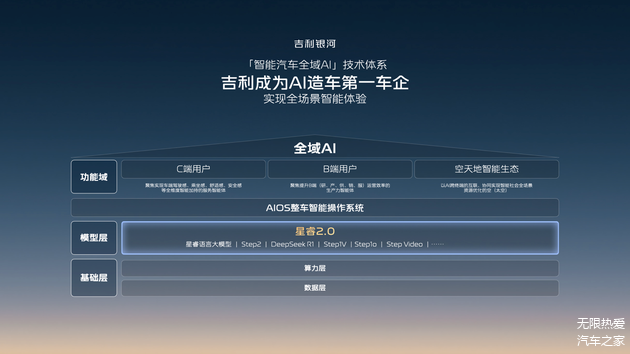 吉利是全球唯一完成全域AI智能化布局的车企。目前,GEA智能新能源架构、雷神EM-i超级电混、星睿AI云动力、AI银河精灵等前端AI科技成果,已应用于架构、动力、底盘、座舱等智能汽车全域。同时,吉利还将AI深入到产品研发、生产、售后服务等全链路环节,实现了全场景的智能体验,成为AI造车的第一车企。
