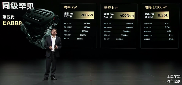 咱们来看一下途昂 Pro 搭载的第五代EA888发动机的基础参数,其最大功率为200kW,最大扭矩为400N・m,匹配7速湿式双离合变箱,0-100km/h加速时间7.6秒,WLTC工况油耗为每百公里8.35L。