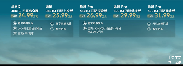 近日, 上汽大众途昂 Pro 正式上市,指导价为30.99万-35.99万元,一口价区间为26.99万-31.99万元,定位为中大型SUV。
