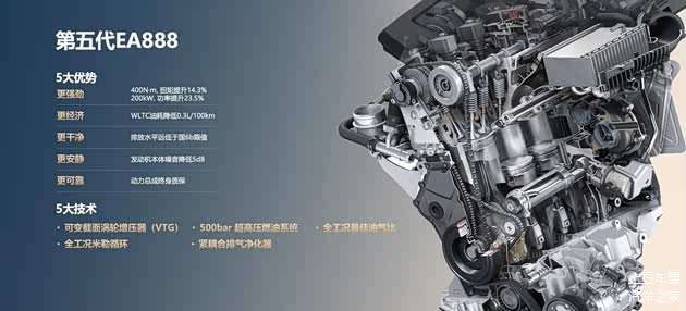 重点来了,新车搭载第五代EA888发动机,拥有VTG可变截面涡轮增压器,可提升低速扭矩,同时拥有500bar超高压燃油系统,能够更加精准地燃油喷射控制,以及带来更好的雾化效果。