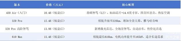 通过以上对比分析,不难看出,430 Air版(权益后10.48万)满足基础智能需求,适合城市通勤,对于预算有限用户相当友好。而对于科技尝鲜群体而言,520 Pro高阶智驾版(13.98万)是智驾功能最完整的版本,激光雷达+Orin-X芯片未来可升级潜力大,更是值得入手。当然了,假如是有长途出行的家庭需求,那么610 Max版(15.48万)续航优势明显,搭配外放电功能适合露营场景,简直是明智之选。