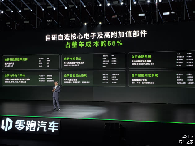 除了上面提到的全域自研的电子电气架构,零跑表示他们的核心部件自研比例高达65%,覆盖电驱、电池、电子架构等关键领域。包括这次零跑应用在零跑B10上面的7合1油冷电机、27合1超级集成热管理架构等等,都是自研来做、快速上车。